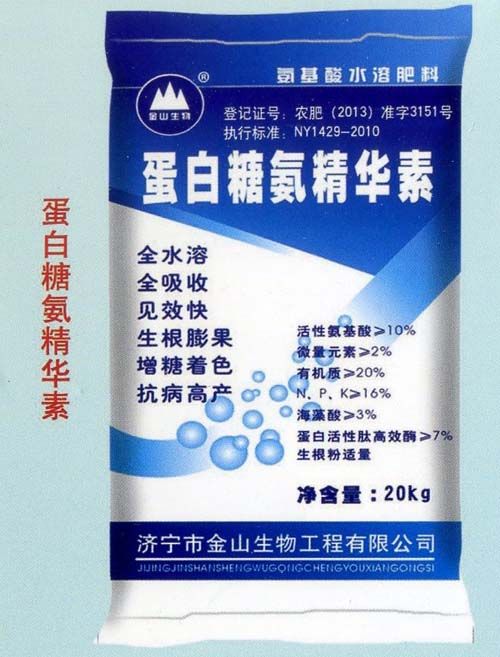 產(chǎn)品特點:本品主要針對經(jīng)濟作物的需肥規(guī)律,采用國內(nèi)先進的科研成果,以18種氨基酸為基礎(chǔ),再配20%的有機質(zhì),生化黃腐酸,16%的NPK,多種鋅鐵鎂硼鈣中微量元素,及活性肽、蛋白質(zhì)、活性酶、生長素及類生物菌,科學(xué)復(fù)配而成。配方合理營養(yǎng)全面,速溶。即可補充作物生長所需要的各種營養(yǎng)元素各種活性因子又能促進作物健壯成長,各種微生物的作用又能產(chǎn)生抗生素,生長素使作物抗病性強、生長快、大量有機質(zhì)是作物根系形成良好的微生態(tài)系統(tǒng),改善土壤理化性質(zhì),破除土壤板結(jié)提高土壤的保水、保肥性。增強根的吸收能力提高其他肥料的利用率,提高產(chǎn)量改善品質(zhì),增加效益。